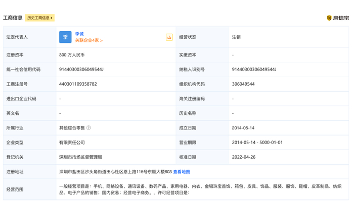 上述涉事公司深圳市安若依电子商务有限公司成立于2014年, 是一家以从事批发业为主的企业,曾因登记的住所或经营场所无法联系而被列入企业经营异常名录,该公司已于2022年04月26日被注销。