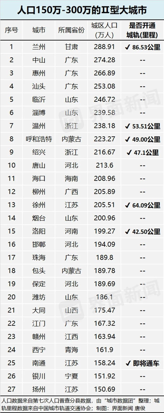 而在Ⅱ型大城市中,只有8个已开通城轨,分别是兰州、温州、呼和浩特、绍兴、徐州、洛阳、芜湖、昆山。另外,南通地铁已开始试运行,即将正式通车。