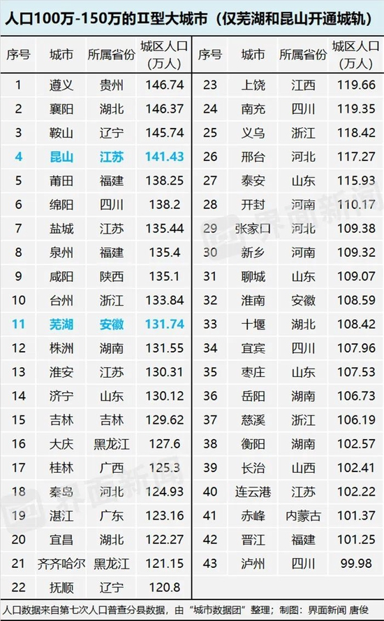 城区人口低于150万的大城市有43个,只有芜湖和昆山两个城市已开通城轨。昆山地铁是上海地铁的延伸线,只有6公里。芜湖开通了2条单轨,总里程为46.2公里。