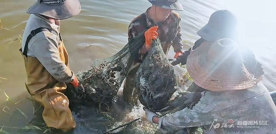 阿拉尔市长鑫渔业有限责任公司的工人正在捕捞螃蟹(资料图)。 □黄兆华摄
