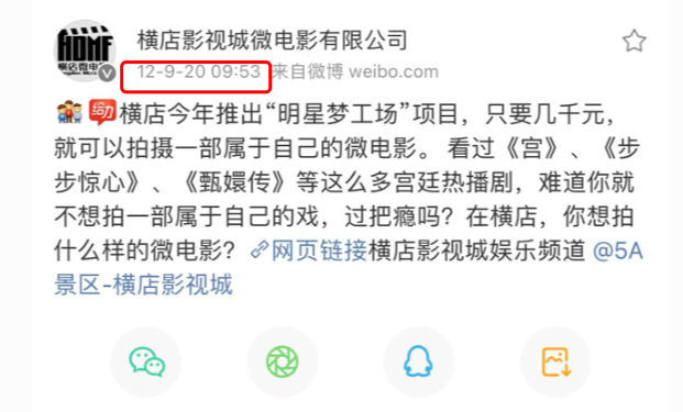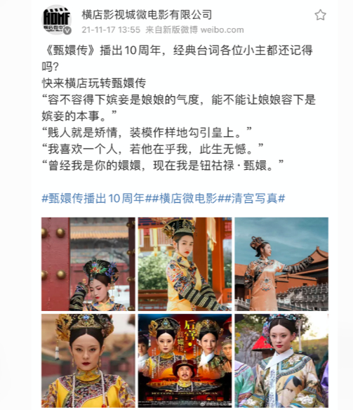 到了2013年,横店影视城微电影有限公司在微博分享一组游客拍摄《甄嬛传》的剧照,从服装、道具到拍摄场景一应俱全,但彼时参与拍摄的游客并未在网络上引发太大关注。