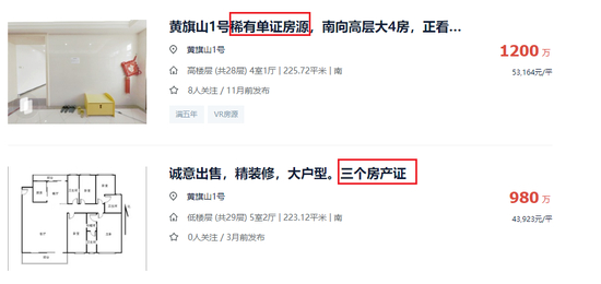 以东城黄旗山1号为例,据贝壳平台挂牌显示,目前有两套面积大小相近的大户型同步挂牌中,其中单证房源单价去到5.3万元/㎡,另外一套三个房产证的则仅报价4.39万元/㎡,总价相差约200万元,虽一个为高楼层一个为低楼层,但差距仍较为明显。