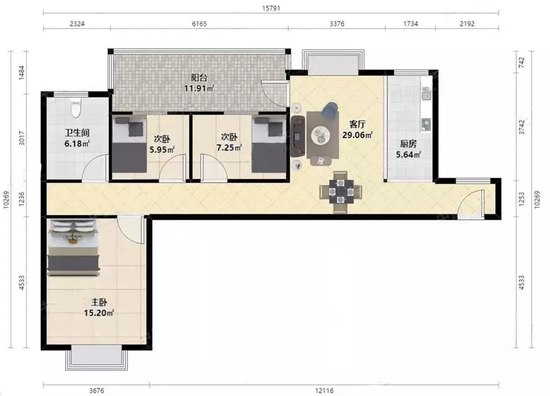 以下图某个被拆开的88㎡3房为例,除了狭长的过道外,无处安放的餐厅位置显得十分尴尬,超大的阳台又诠释着项目原本的豪宅特性.....该单元要顺利出让,必然只能低价卖出。