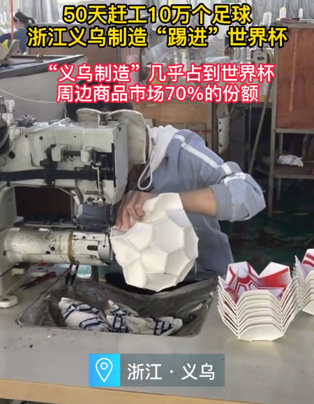 义乌最近很忙。为了即将揭幕的卡塔尔世界杯, 50天赶工10万个足球的消息让义乌人颇为骄傲。据义乌体育用品协会估算,从足球到旗帜、球衣,“义乌制造”几乎占到整个卡塔尔世界杯周边商品市场的70%。