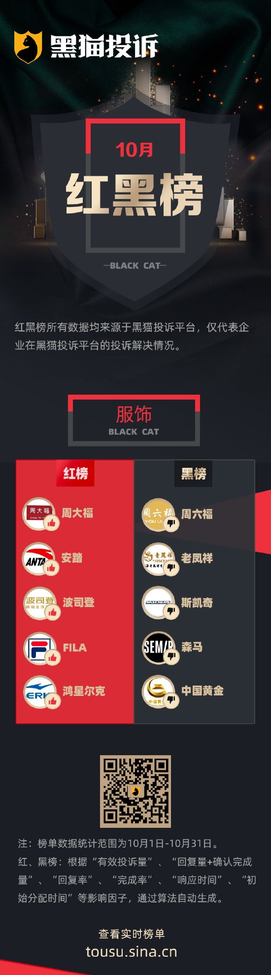 10月黑猫投诉服饰领域红黑榜:周六福抽奖诱导消费