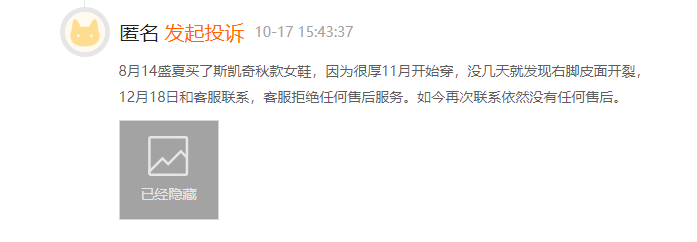 有消费者在黑猫投诉平台上反映称购买的斯凯奇儿童鞋仅半月,质量出现严重问题,鞋子底部、前部开胶,同时鞋面开裂、左右脚不一致等质量问题也层出不穷。截至10月底,斯凯奇在黑猫投诉平台上累计投诉达799单。