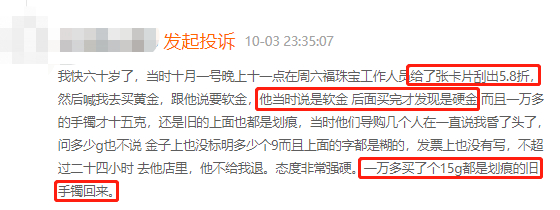 近期有大量用户反馈,在周六福抽奖,刮出5.8折的优惠券,工作人员以此优惠消费者购买黄金。在购买过程中,用户明确提出购买“软金”,拿到手却发现是“硬金”,且为“一口价黄金”,用户表示“一万多买了个15g都是划痕的旧手镯”,遭遇售后难等问题。截至10月底,周六福收到投诉共计394单,回复率为18%。