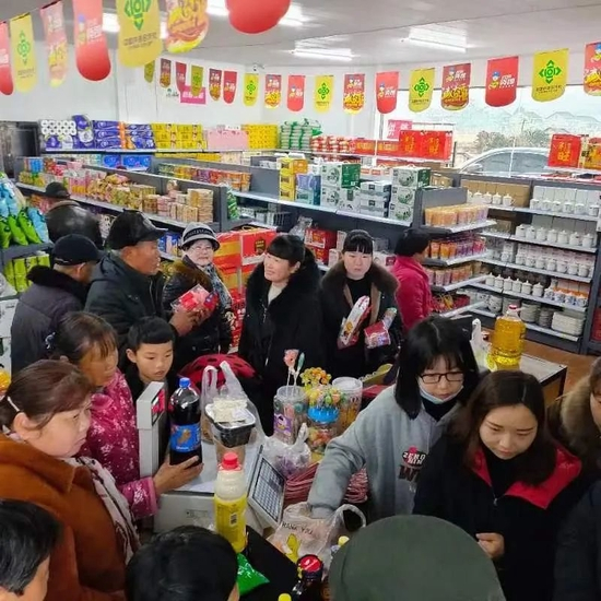 2021年2月4日,湖南益阳市赫山区龙光桥镇,天成院村"供销货郎"直营店开张,人们在店内购物。摄影/张志斌