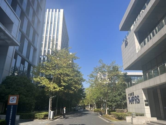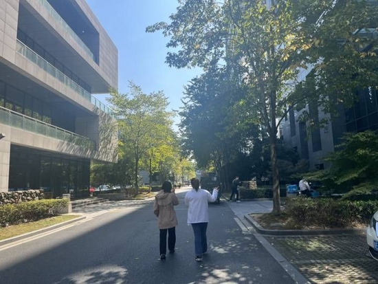 相比由厂房和办公楼组成的产业园区,地理信息小镇更像集成式社区。鳞次栉比的建筑背后就是郁郁葱葱的塔山。中午十二点左右,三三两两的年轻人走在宽敞的林荫道上,有的则和同事坐在咖啡店外的遮阳伞下闲聊。便利店、理发店、餐厅和小酒吧等生活配套散落在离办公楼一公里的范围内,用人才码扫一扫小镇上随处可见的小绿车,很快就能到达。