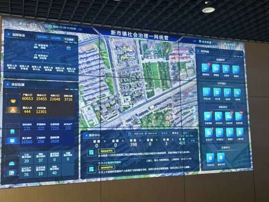 图像两侧不同颜色的数据显示着当地人口、重点场所和治理事项等各项信息。系统收到信访信息后,能匹配到离事发点地理位置最近的工作用车和工作人员,直接分发。