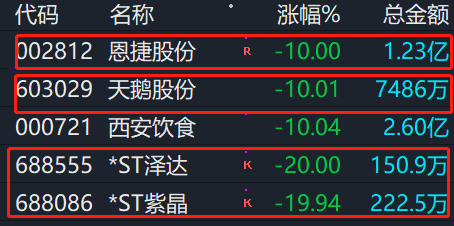 今天上午一开盘,恩捷股份、天鹅股份、*ST泽达、*ST紫晶4只个股均“一”字跌停。