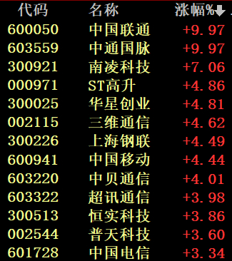 上午临近收盘,通信服务板块突然爆发,中国联通涨停,最新市值为1298亿元。中国电信、中国移动也大幅冲高。