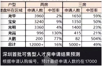 11月23日,《每日经济新闻》记者从某知情人士处获取的一份预测认购数据显示,两房申请家庭数远高于三房,且预计申请最终家庭数将在1.7万。不过,有些项目的两房预计中签率仅约2%,而三房预计中签率均超过两位数,位于大鹏新区项目更是只要报名就能买到。
