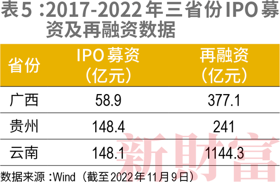 对接资本市场,可以为企业长足发展带来资金支持。从融资角度看,三地公司近5年IPO募资金额上,贵州和云南均达到了148亿元,而广西仅为58.9亿元,不足前两者的一半。不过,从已上市公司的再融资情况看,2017年至今,广西进行了增发、配股等再融资行为的上市企业数量为18家,再融资金额达到377.1亿元,虽然少于云南的23家企业的1144.3亿元,但高于贵州公司的241亿元(表5)。