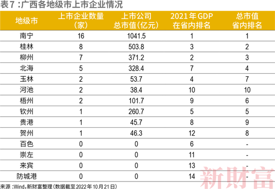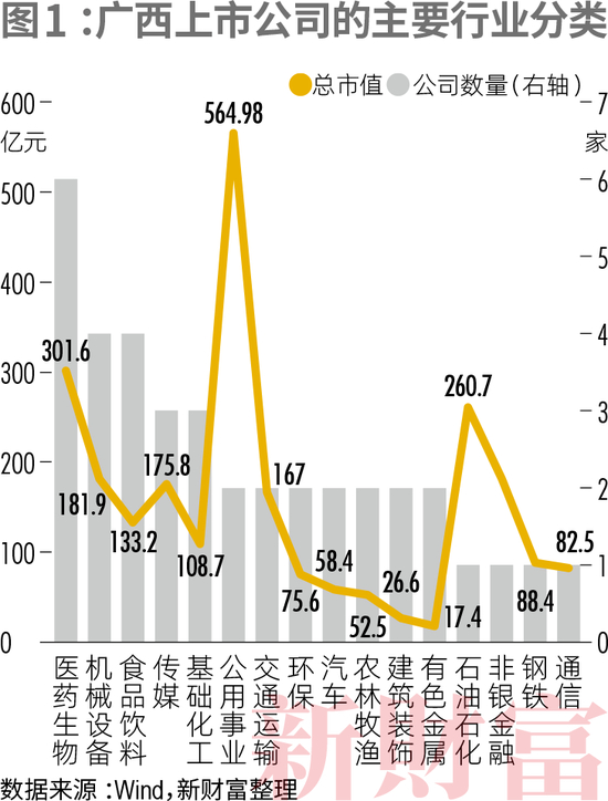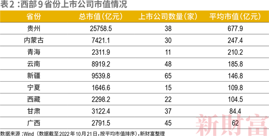 新财富计算发现,广西上市公司数量是贵州和甘肃的1.2倍、内蒙古的1.5倍,但从市值看,却仅约为贵州的1/10、内蒙古的1/3,也低于甘肃。