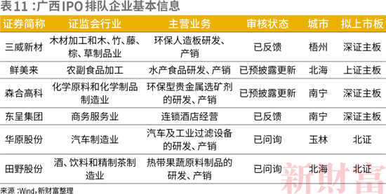 从A股整体来看,Wind数据显示,目前正在IPO排队显示状态正常的公司共有727家,广西的6家占比为0.8%,与当前已上市公司数量在全国的占比一致,说明未来一段时间内,广西上市公司在数量上难以出现较大突破(表11)。