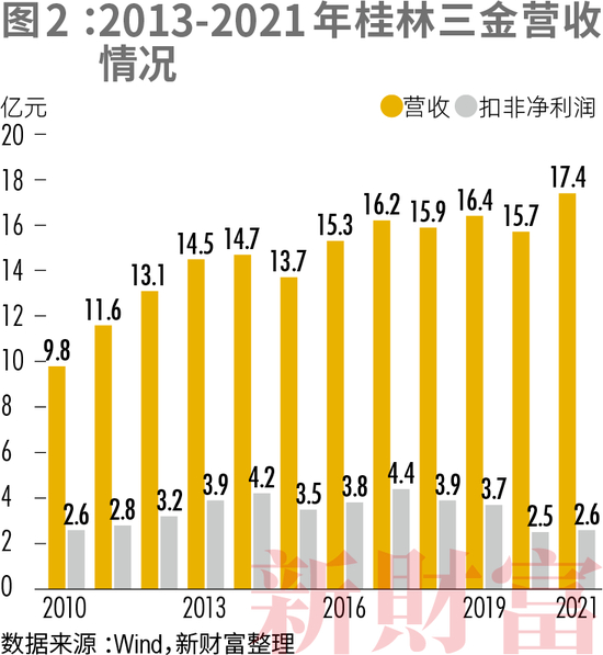 桂林三金同样因过度依赖老产品而难以实现业绩突破。这家公司于2009年上市,随后5年间实现了营收从9.8亿到14.7亿元的增长,扣非净利润从2.6亿元增加到了4.2亿元,公司实控人、董事长邹节明曾在2010-2016年六度入围“新财富500富人”。