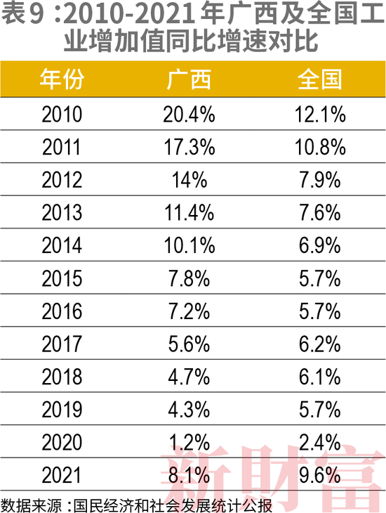 然而,广西的工业增加值同比增速却从2010年远超全国水平,到近几年增速慢于全国(表9)。数据显示,2010-2016年,广西每年的工业增加值同比增速都高于全国水平,2010年甚至比全国高出8.3%,但2017年之后,广西工业增速显著放缓,2020年的增速降至1.2%,虽然2021年回升至8.1%,但依然低于全国数据。