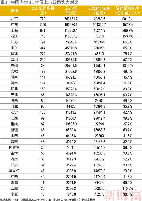 与之相对,北京的资产证券化率达到901.9%,广东、浙江、上海等省份均超过100%。此外,同属西部的贵州、西藏高于100%,甘肃、宁夏等省份也均在广西之上。