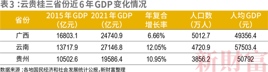 根据第七次人口普查数据,广西人口共有5012.7万人,多于云南的4720.9万人和贵州的3856.2万人。因此,人均GDP上,广西为三省份中最低。