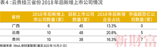 除了GDP增速慢于云贵两省,在资本市场发展上,广西也处后位。自2018以来的5年间,广西新增上市公司共6家,但这些公司当前的市值均不足百亿,云南和贵州在5年中都新增了10家上市公司。