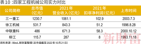 从上市时间来看,1993年就已登陆资本市场的柳工,是A股近500家机械设备公司中第二个上市的,仅比1992年上市的神州高铁(000008)晚。然而,其当前市值为115.7亿元,排在第70名,远低于同属于工程机械领域的三一重工(600031)、徐工机械(000425)、中联重科(000157)等公司,柳工在总营收和总市值方面也低于上述公司(表10)。