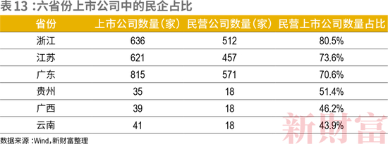 从企业属性看,广西在A股上市的39家公司中,央企和地方国企共有19家,外资企业2家,民营企业18家,民企占比不到50%。而浙江、江苏、广东这些经济强省,上市民企数量占比普遍高达70%以上。由此连带反应,广西也继续缺席2022新财富500富人,成为内地31省份中唯一缺席的地区。当然,民营经济活力不足,非广西个案。同属西部地区的贵州、云南等地,也存在民营上市公司数量少的问题(表13)。