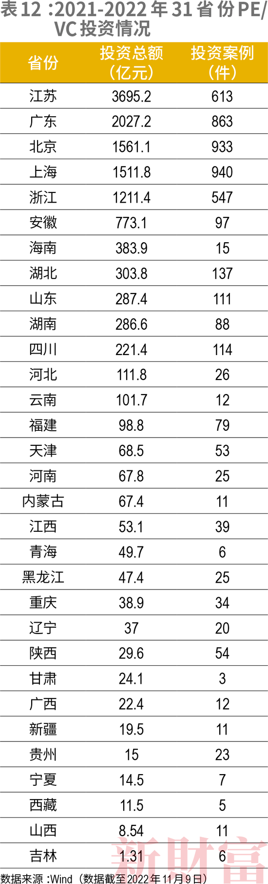 从一级市场的PE/VC投资来看,广西的创投也不活跃。近两年,广西总投资案例12个、总投资金额为22.4亿元,而周边的云南案例数也是12个,金额达到101.7亿元,海南的投资案例为15个,总投资金额达到384亿元(表12)。