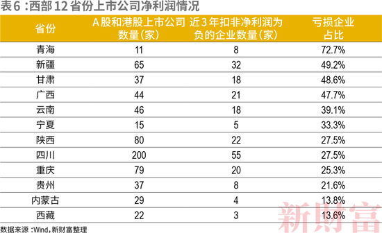 国家西部大开发涉及的12个省份中,多个省份也存在上市公司经营状况欠佳的情况。比如,青海扣非净利润出现负值的上市企业占比达72.7%,新疆、甘肃两地亏损企业的比例与广西接近,占比都在48%左右(表6)。