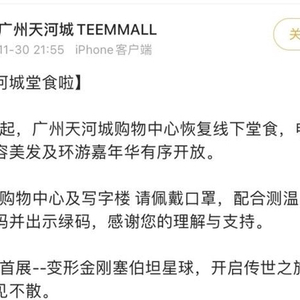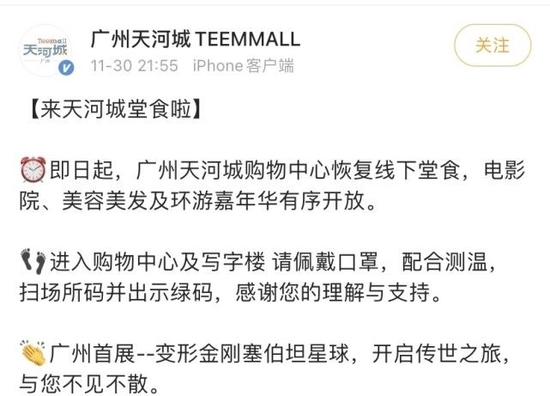 11月30日晚9点55分,广州天河城购物中心官方微博发布消息:即日起,广州天河城购物中心恢复线下堂食,电影院、美容美发及环游嘉年华有序开放。进入购物中心及写字楼请佩戴口罩,配合测温,扫场所码并出示绿码。