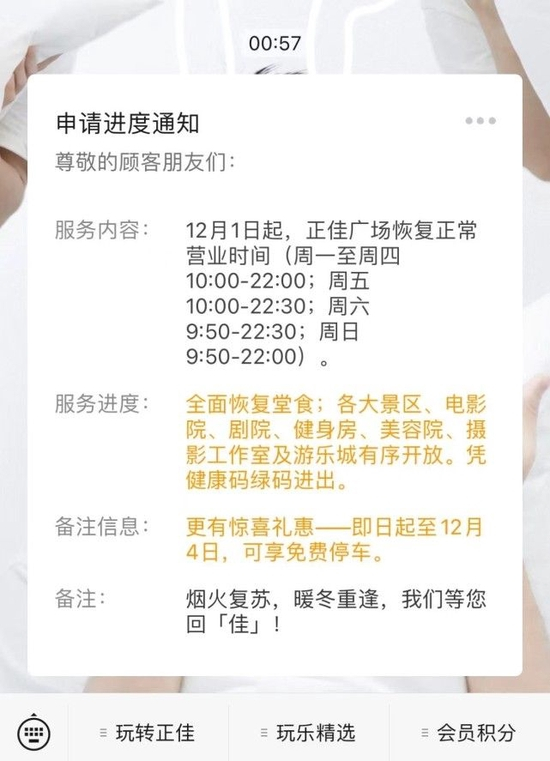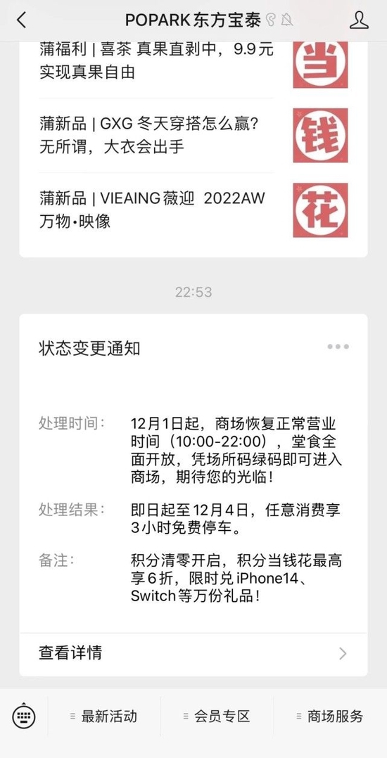 随后,东方宝泰广场官方公众号在晚上10点53分发布通知:12月1日起,商场恢复正常营业时间(10:00-22:00),堂食全面开放,凭场所码绿码即可进入商场。