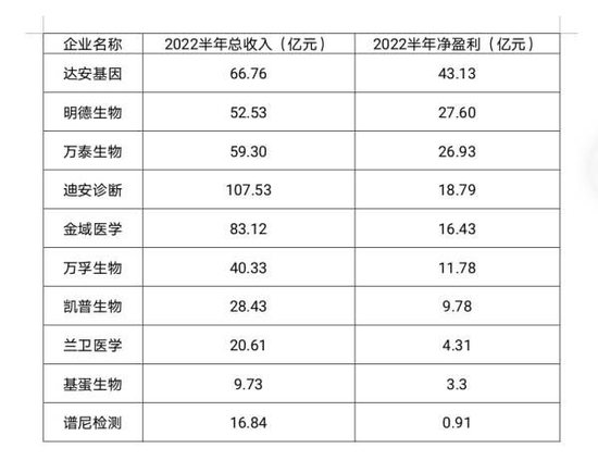 有核酸检测业务的10家上市公司今年上半年的收入和盈利情况