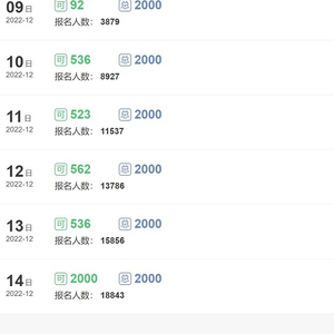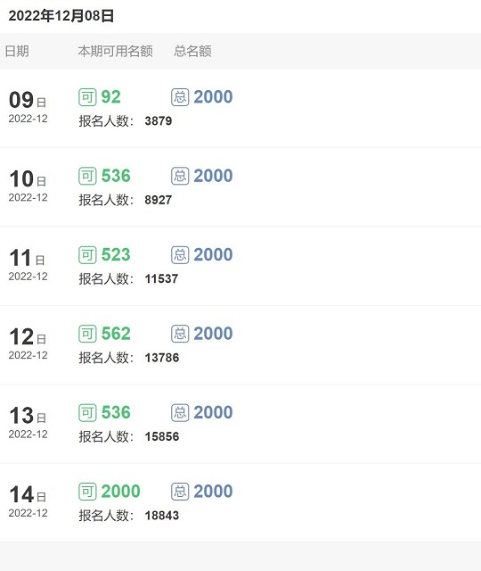 12月9日15时,该系统页面显示,12月15日共有16366人报名摇号,当期可用名额为2000个,当日申报时间到18时截止。与此同时,12月10日至14日还有340个名额可供继续摇号。