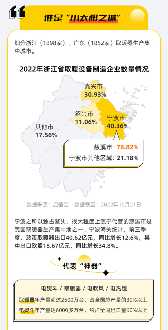 其中,浙江慈溪、广东顺德是取暖器最聚集区域,有“中国取暖器之乡”的慈溪出口量更独占全国三分之一,堪称“小太阳之城”。今年前三季度,慈溪取暖器出口40.62亿元,同比增长12.6%。