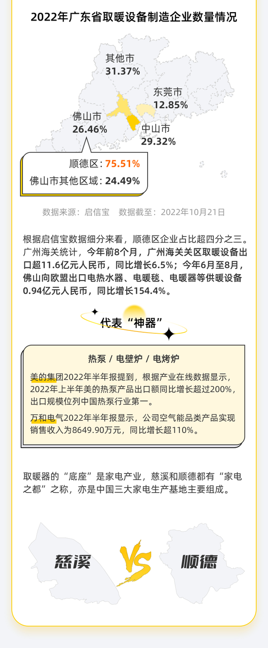 这是顺德制造的一个缩影。作为家电行业的细分赛道,取暖设备制造背后离不开家电制造实力的硬核支撑。顺德和慈溪都号称“家电之都”,家电行业年产值已分别突破2000亿元、1000亿元。