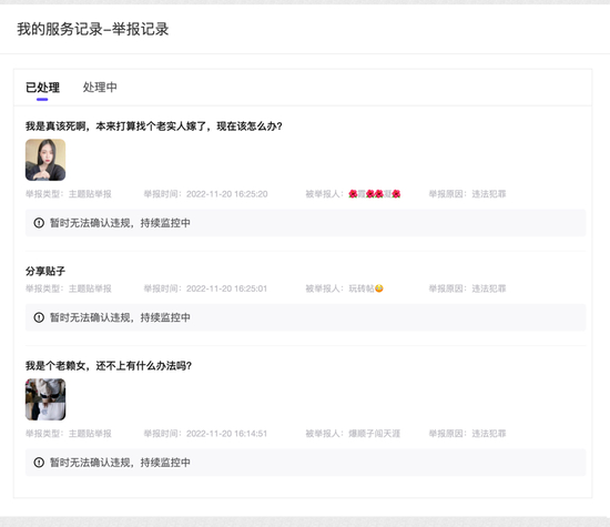 在系统监控无效的情况,用户举报本应成为10多亿用户量级的贴吧维护信息安全的有效手段。但在调查过程中,记者多次对此类帖子点击举报,直至截稿这些举报均未能奏效,反馈结果中仅显示“暂时无法确认违规,持续监控中”,原帖仍可正常点击打开。