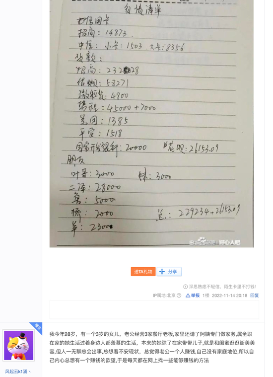 “30岁的我负债127个W,用了一个月还了40个的外债,我终于踏上了上岸的道路。”11月14日,网民为“风起云k1涌丶”(下称“K1”)的贴吧用户在“好心人吧”发帖讲故事,至11月20日,该帖已有295个回复,长达9页。