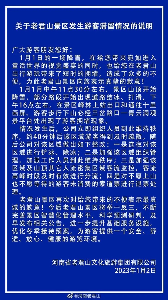 河南老君山称,“1月1日的一场降雪,给您在老君山出行游玩带来了短时的拥堵,造成了众多的不便,为此老君山景区向您表示真挚的歉意。”