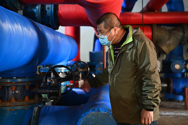 2022年10月20日,在黑龙江省哈尔滨市呼兰区一家供热企业,工作人员在换热站内查看仪表数据。新华社图