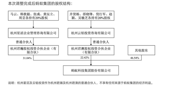 如今,马云等4人已终止一致行动协议。杭州君瀚和杭州君澳由同受杭州云铂控制,分拆为受杭州云铂、杭州星滔分别控制。相关普通合伙人企业的股东,由马云及其一致行动人,变为蚂蚁管理层、员工代表和马云的组合。根据公告,杭州云铂和杭州星滔作为普通合伙人企业,不享有任何来源于蚂蚁集团的经济利益。也就是说,此次调整只涉及投票权,不涉及经济利益。