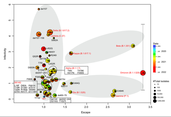 )x轴表示SARS-CoV-2变种的免疫逃逸能力,y轴表示SARS-CoV-2变种的细胞感染性。扇面颜色标志着GISAID数据库中记录的所示变体的分离时间。每个扇区的面积大小表示截至到2022年7月(每个月)分离的单个变异株的数量。灰色阴影表示进化路径。图片来源:武汉大学病毒学国家重点实验室