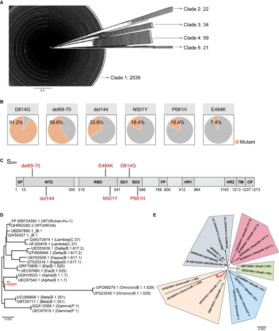 S蛋白突变的路径不同导致了抗原性的改变。因此,单一毒株的疫苗成分无法有效保护人群对抗不同进化路径上的其它变异株。为了获得一个能够覆盖绝大多数变异株的广谱免疫原,研究团队分析了NCBI数据库中的2675条新冠病毒S蛋白序列,通过进化聚类(图A),计算所有突变位点的发生频率(图B),最终设计了一种覆盖共性突变的拟合新抗原(Span)(图C)。结果表明,Span序列位于S蛋白系统发育树的中心位置(图D)。