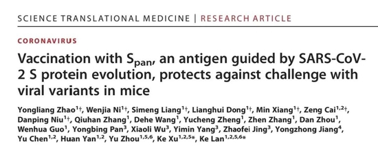 据悉,通过追踪新冠病毒的进化轨迹,武汉大学病毒学国家重点实验室蓝柯教授和徐可教授团队设计出一种新型新冠广谱疫苗,或可抵御未来新冠变异株对人群的侵害。1月4日,该研究论文在知名学术期刊《科学-转化医学》(Science Translational Medicine)上发表。