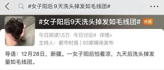 “女子阳后9天洗头掉发如毛线团”甚至上了微博热搜榜。