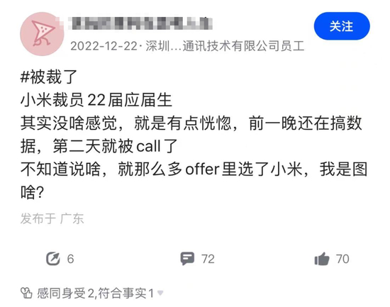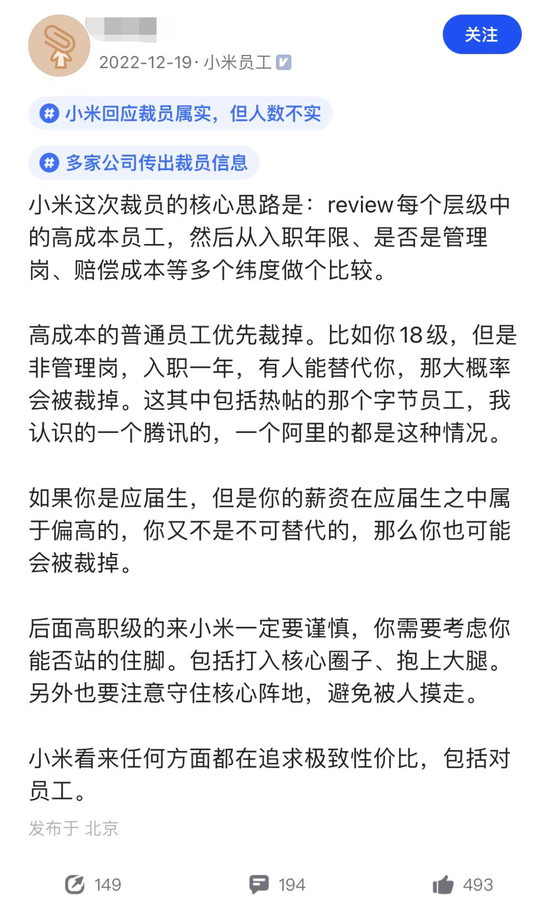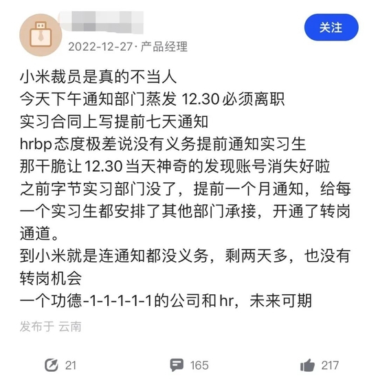 这几天,在社交平台上,一篇关于小米裁员的帖子火了。