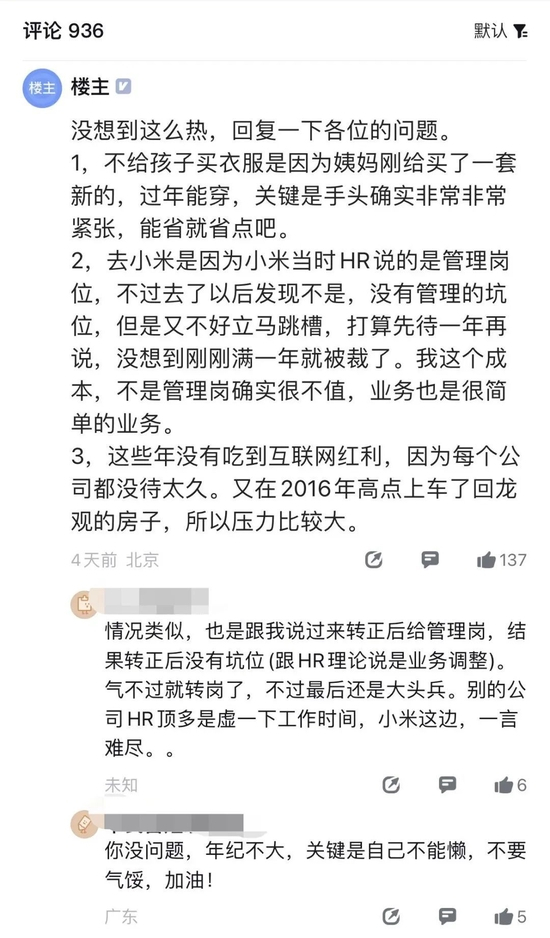 在评论中,楼主也解释道,去小米是因为小米当时HR说的是管理岗位,不过去了以后发现不是,没有管理的坑位,但是又不好立马跳槽,打算先待一年再说,没想到刚刚满一年就被裁了。