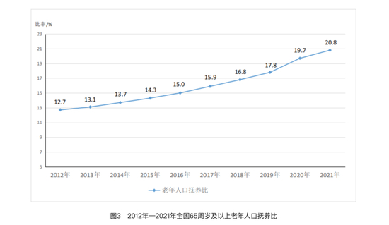 老年人口抚养比是指某一人口中老年人口数与劳动年龄人口数之比,用以表明每100名劳动年龄人口要负担多少名老年人。《2021年度国家老龄事业发展公报》显示,2021年全国65周岁及以上老年人口抚养比首次突破了20%,达到20.8%,即100名劳动年龄人口需要负担20名65岁以上的老年人,即5名年轻人要赡养1位老人。