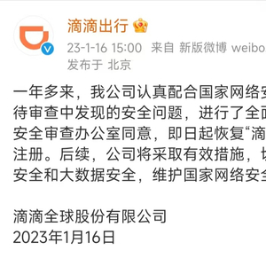 2023年1月16日下午,滴滴出行在其官方微博发文表示,公司已配合国家网络安全审查,并进行了全面整改,经报网络安全审查办公室同意,即日起恢复“滴滴出行”的新用户注册。