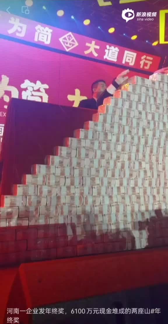 6100万元现金,61万张百元大钞,堆在一起发年终奖是怎样的感官冲击?1月17日晚间,河南省矿山起重机有限公司(下称“河南矿山”)的企业年会上给出了答案。堆叠成山的现金惹得网友纷纷感慨,“太壕了!”