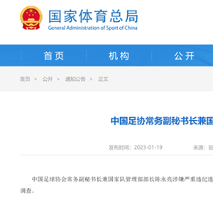 国家体育总局网站19日消息,中国足球协会执委、原秘书长刘奕涉嫌严重违法,常务副秘书长兼国管部部长陈永亮涉嫌严重违纪违法,目前正在接受纪检监察机关调查。